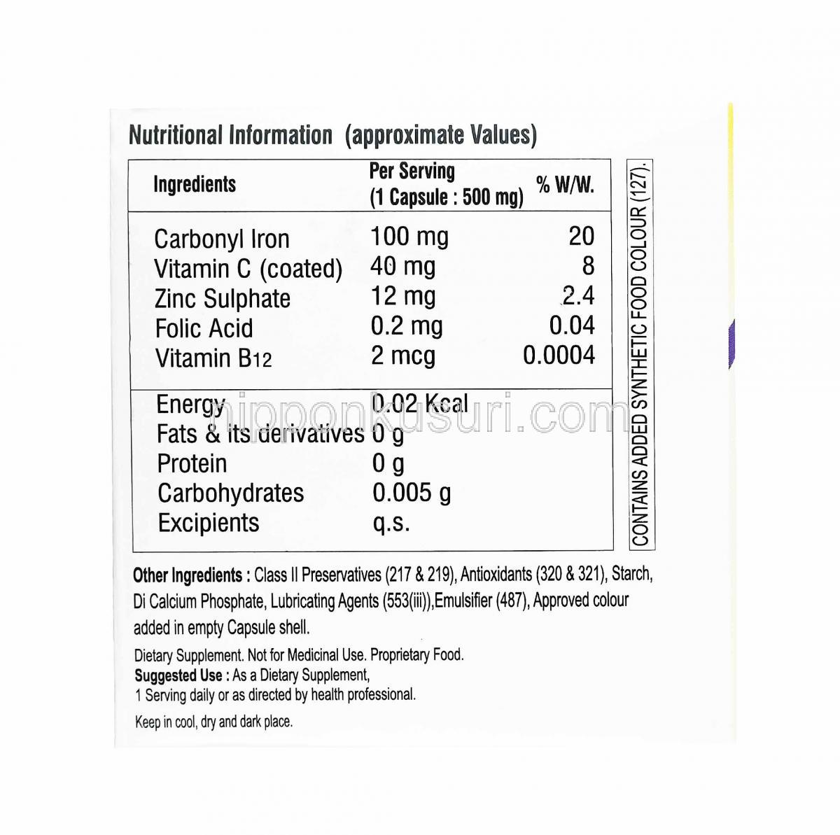 | 有効成分 | カルボニル鉄/ ビタミンC/ 硫酸亜鉛/ 葉酸/ ビタミンB12, Carbonyl Iron/ VitaminC/ Zimc Sulphate/ Folic Acid/ VitaminB12 |