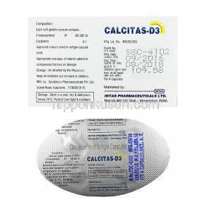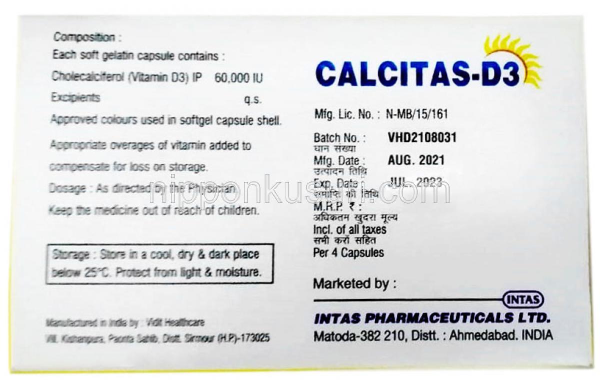 カルシタス D3 (コレカルシフェロール(ビタミンD3)) カプセル カルシタス D3, コレカルシフェロール 60,000 iu, カプセル, 製造元: Intas, 箱表面 カルシタス D3, コレカルシフェロール 60,000 iu, カプセル, 製造元: Intas, 箱情報