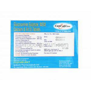 | 有効成分 | グルコサミン硫酸カリウム塩化カリウム/ メチルスルホニルメタン/ 炭酸カルシウム/ ビタミンD3, Glucosamine Sulphate Potassium Chloride/ Methyl Sulphonyl Methane/ Calcium Carbonate/ Vitamin D3 |