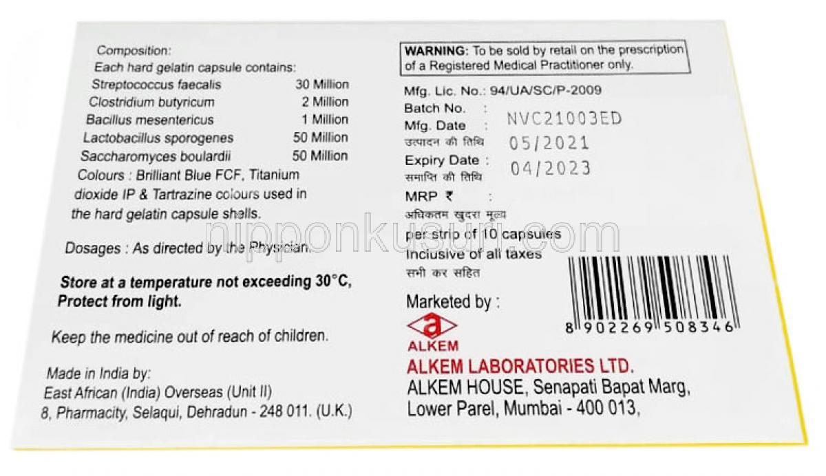 | 含有量 | Bacillus mesentericus 100万個/ Clostridium butyricum2百万個/ Lactobacillus sporogenes 5000万個/ Saccharomyces boulardii 5000万個の細胞/ Streptococcus thermophilus 3000万個 |