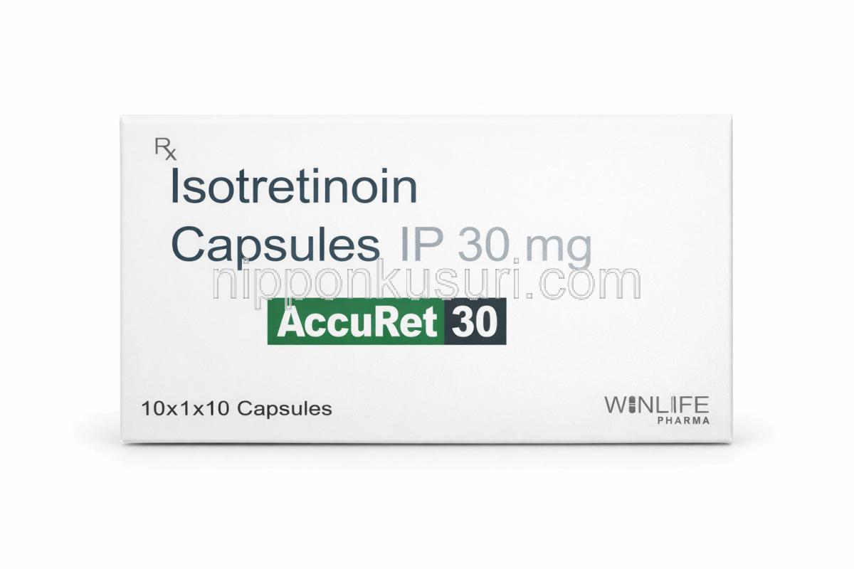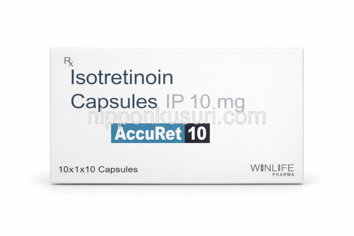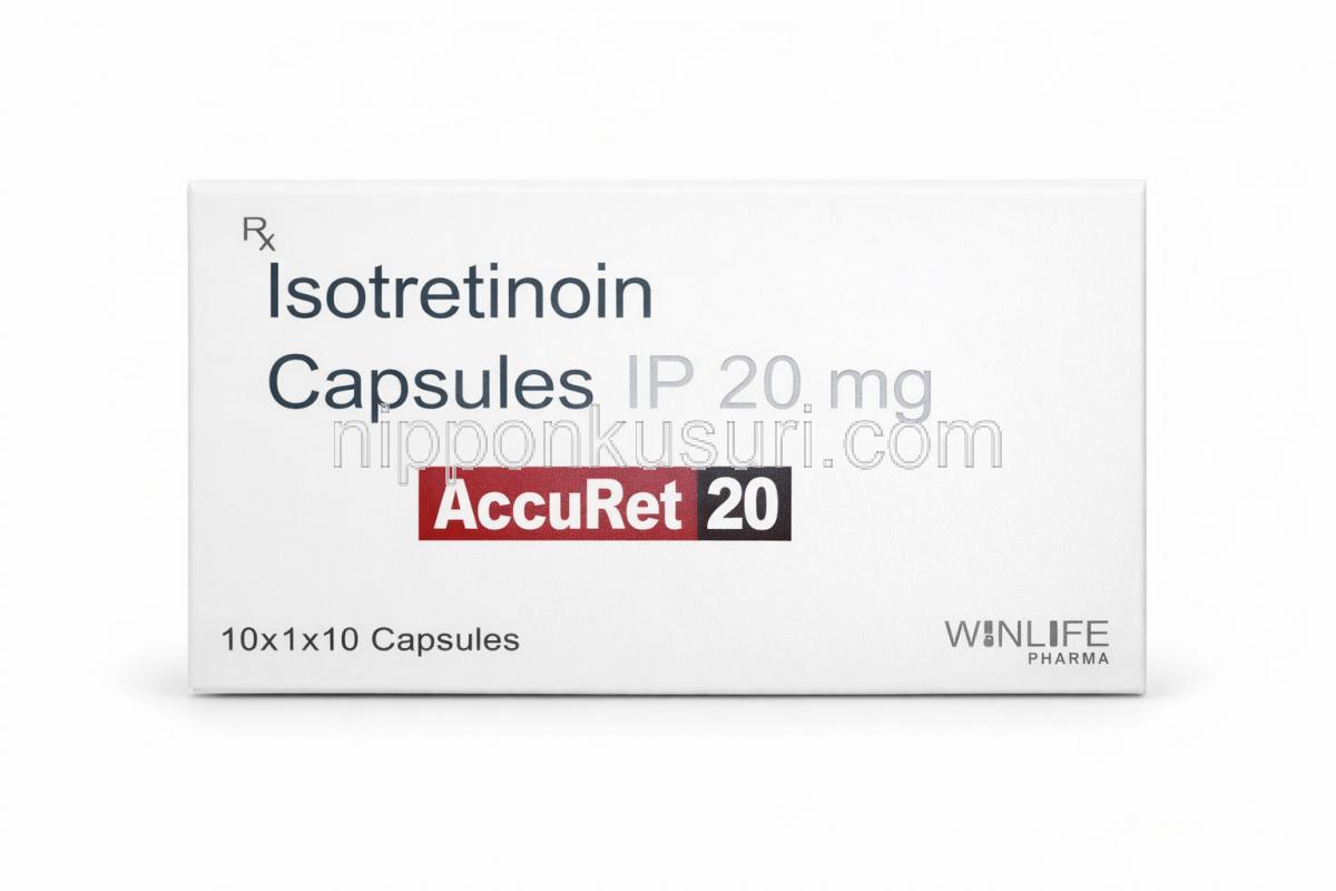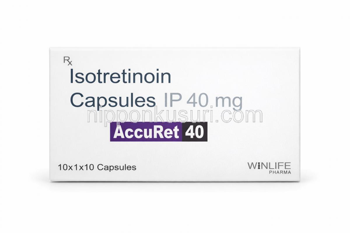 アキュレット 20, イソトレチノイン 20 mg, 製造元:WinLife Pharma, 箱表面 アキュレット 10, イソトレチノイン 10 mg, 製造元:WinLife Pharma, 箱表面 アキュレット 30, イソトレチノイン 30 mg, 製造元:WinLife Pharma, 箱表面 アキュレット 40, イソトレチノイン 40 mg, 製造元:WinLife Pharma, 箱表面