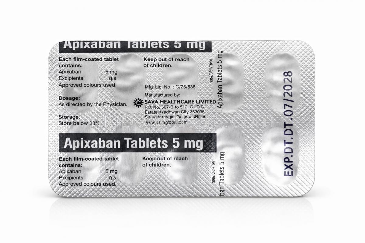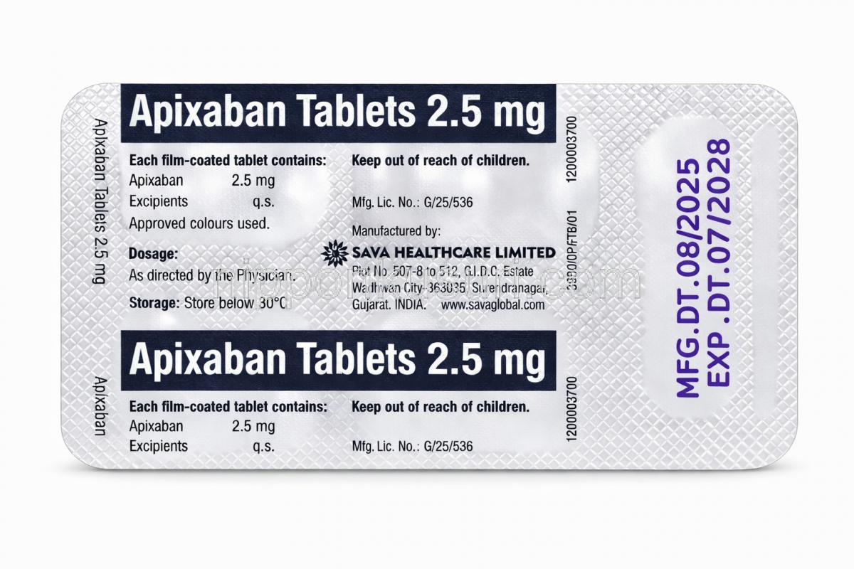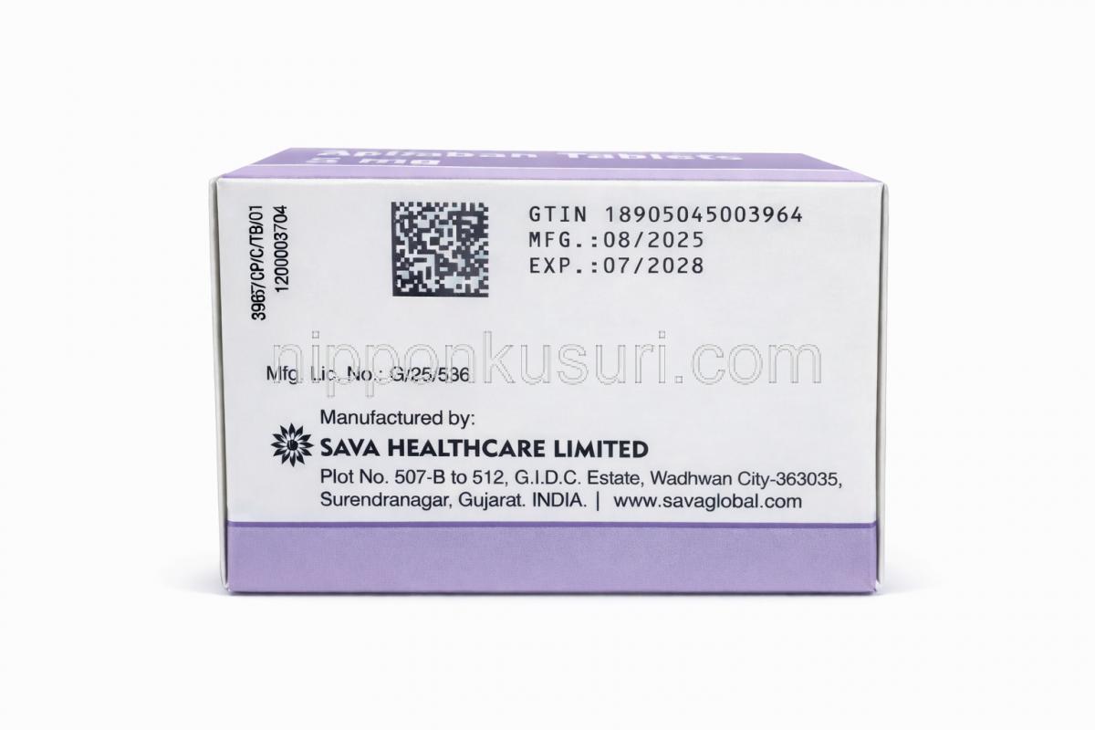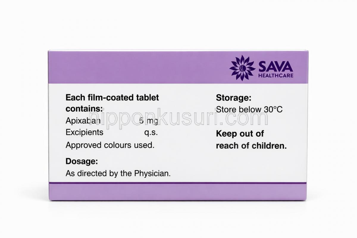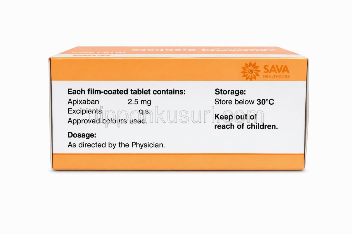 アピキサバン 錠 2.5mg , 包装正面 アピキサバン 錠 2.5mg, 包装裏面 アピキサバン 錠 2.5mg, 箱情報 アピキサバン 錠 2.5mg, 製造元情報 アピキサバン 錠 2.5mg (Sava社製) , 箱側面 アピキサバン 錠 5mg (Sava社製) , 箱 アピキサバン 5mg, 錠剤シート正面 アピキサバン 5mg, 錠 錠剤シート裏面 アピキサバン 錠 5mg, 箱側面詳細