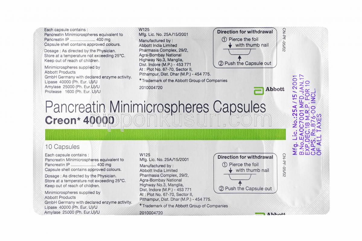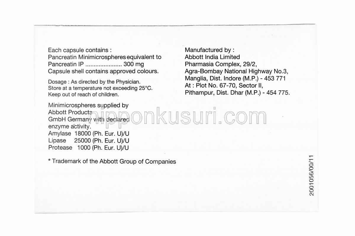 | 含有量 | 150 mg(リパーゼ 10000 IU/ プロテアーゼ 600 IU/ アミラーゼ 8000 IU), 300 mg(リパーゼ 25000 IU/ プロテアーゼ 1000 IU/ アミラーゼ 18000 IU), 400 mg(リパーゼ 40000 IU/ プロテアーゼ 1600 IU/ アミラーゼ 25000 IU) |