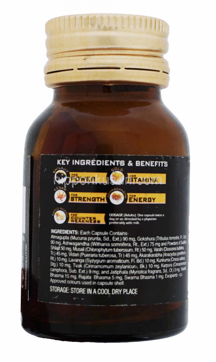 | 有効成分 | アマグプタ/ ゴクシュラ/ アシュワガンダ/ スーダ・シラジット/ ムサリ/ ヴァラヒ/ ヴィダリ/ アカラカラハ/ ラヴァンガ/ クンクマ/ トルバン/ カルパラ/ ジャヤファラ/ ヤサダ・バズマ/ ラジャタ・バシャ/ スワルナ・バズマ, Atmagupta/ Gokshura/ Ashwagandha/ Suddha Shilajit/ Musali/ Varahi/ Vidari/ Akarakarabha/ Lavanga/ Kunkuma/ Tvak/ Karpura/ Jatiphala/ Yasada Bhasma/ Rajata Bhasma/ Swarna Bhasma |