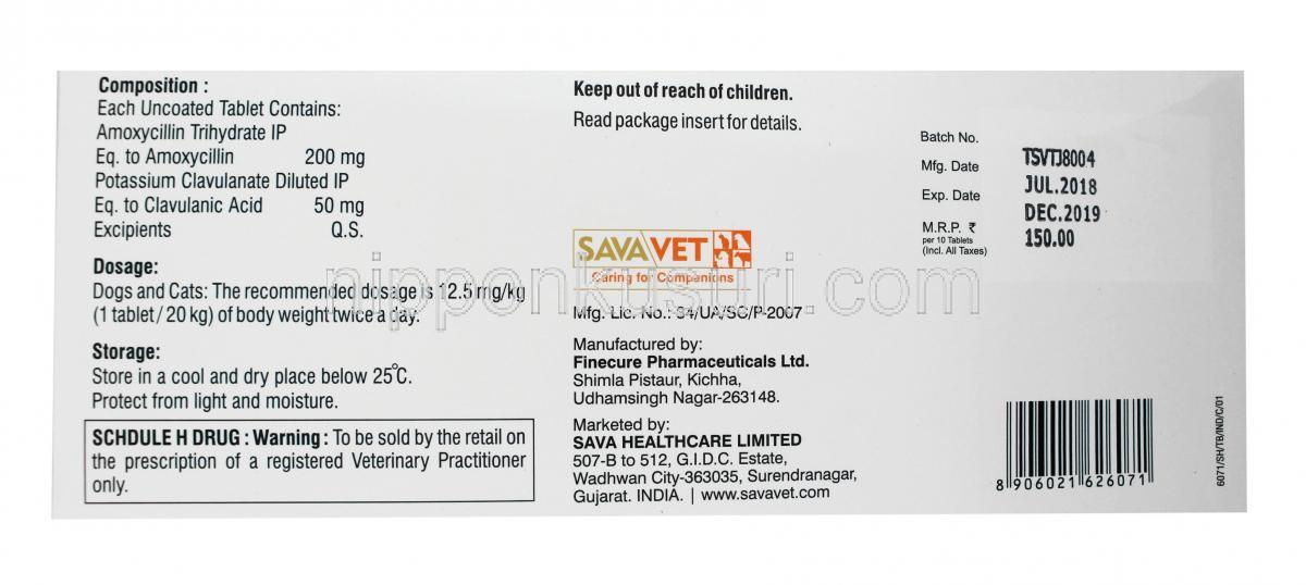 | 有効成分 | アモキシシリン / クラブラン酸, Amoxycillin / Clavulanic Acid |