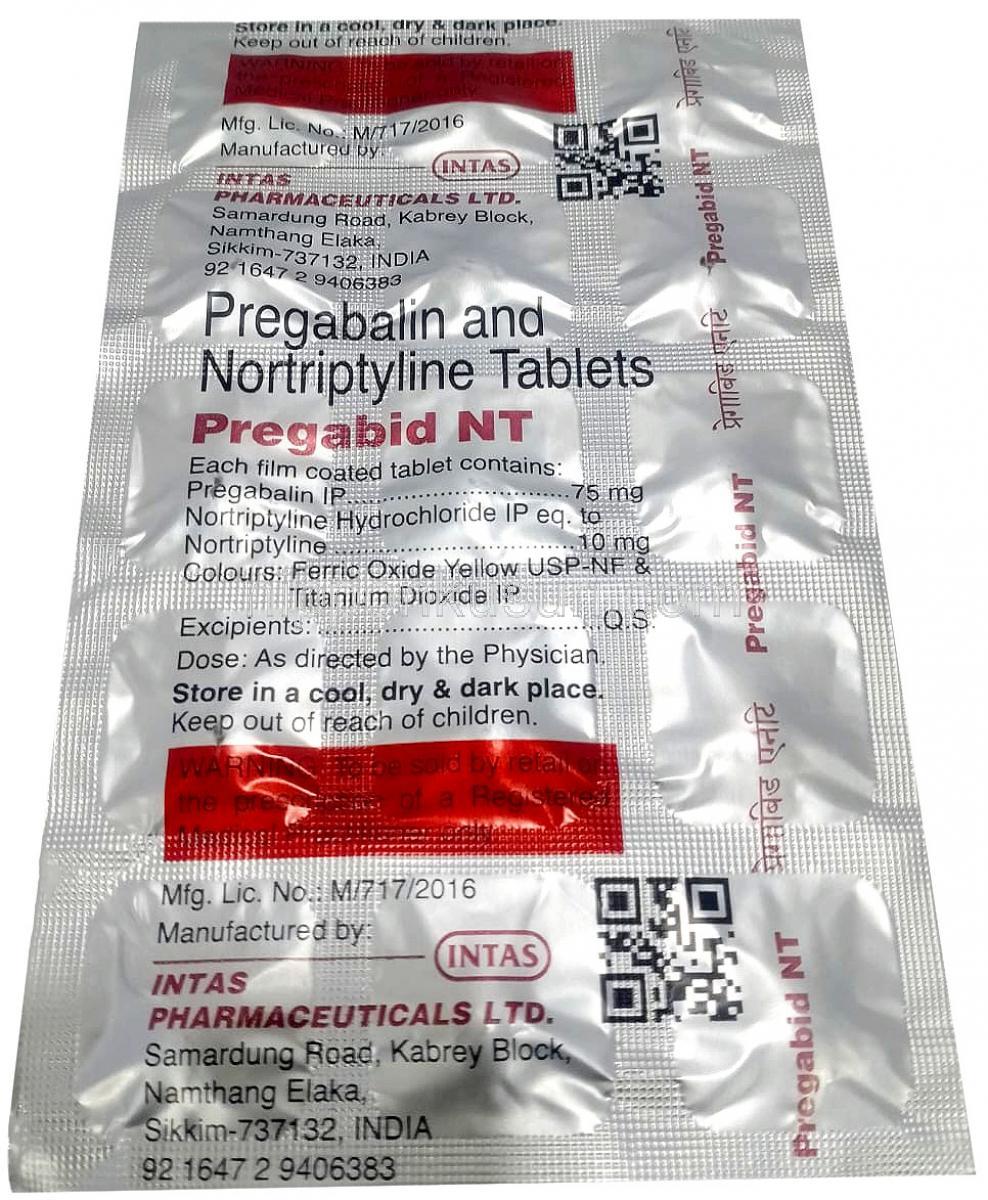 プレガビッドNT, プレガバリン75 mg/ノルトリプチリン 10 mg, 製造元:Intas Pharmaceuticals Ltd, シート情報